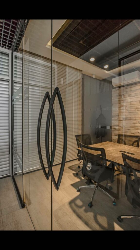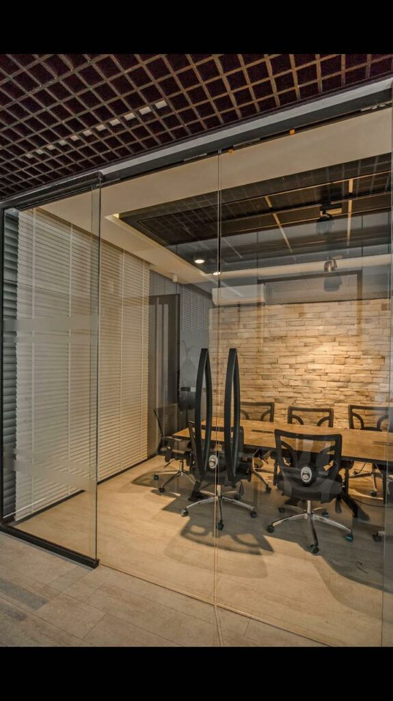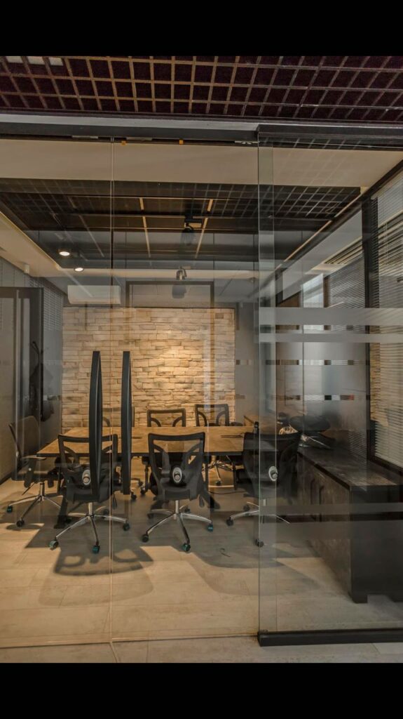 Modern iş dünyasının dinamik ihtiyaçlarına yanıt veren, şeffaflığı ve ergonomiyi merkeze alan üst düzey bir kurumsal ofis çözümü. Tasarladığımız bu toplantı odası, modüler cam bölme duvar sistemleri ile mekanlar arası görsel bütünlüğü korurken, göz hizasındaki kumlama detayları ile gerekli gizliliği sağlıyor..